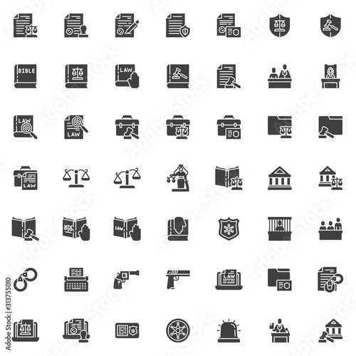 Law and justice vector icons set, modern solid symbol collection filled style pictogram pack. Signs, logo illustration. Set includes icons as courthouse, legal documents, lawyer attorney, jury, judge