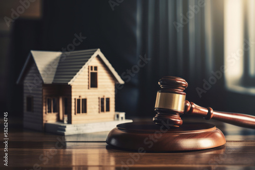 Law and property concept. Judge gavel and house model on wooden table. Generative AI