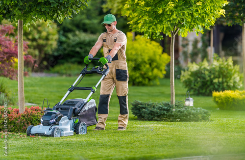 Lawn Care Expert Mows Grass in a Lush Garden During a Sunny Afternoon in Early Spring