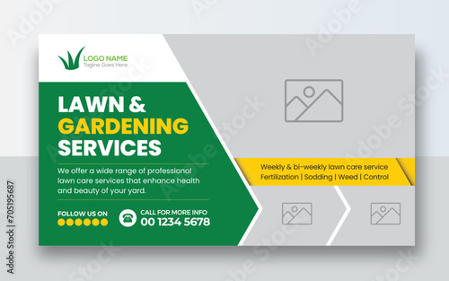 Lawn Mower Garden or Landscaping Service youtube thumbnail and web banner template design | grass, equipment, gardener