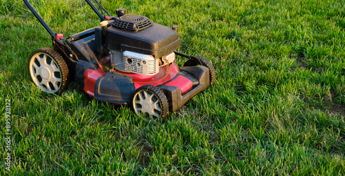 Lawn mower on green grass background. Petrol machine for cutting. Garden care. Electric equipment. Side view. Copy space. Lots of clover weeds. Sport lawn for games. Weed control. High quality photo
