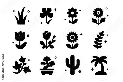 Lawn Plant Icons. Lawn plants. Solid icons set of grass blade, clover, daisy, dandelion, tulip, rose bush, sunflower, fern, ivy, bonsai tree, cactus, palm