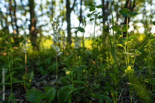 Lawn with green grass in the rays of the setting sun, against the backdrop of trees.