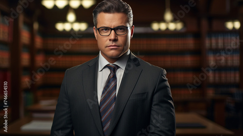 Lawyer Businessman looks serious in a courtroom case-study book legal term career library