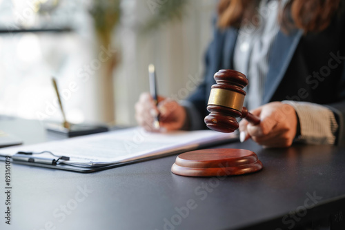 Lawyer deliberating in a courtroom, holding a gavel and writing on a document, symbolizing justice, authority, and decision making