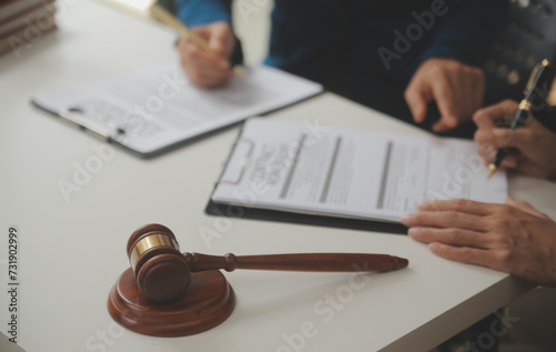 Lawyer, legal advisor, businessman brainstorming information on agreement details Business contracts in legal processing books for accuracy in contract documents. joint financial investment.