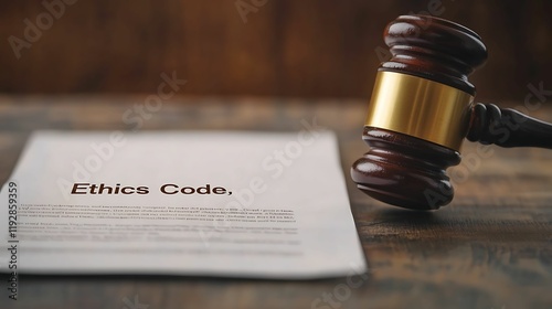 lawyer legal ethics. A wooden gavel rests beside a document titled "Ethics Code," symbolizing legal and ethical standards in a professional context.