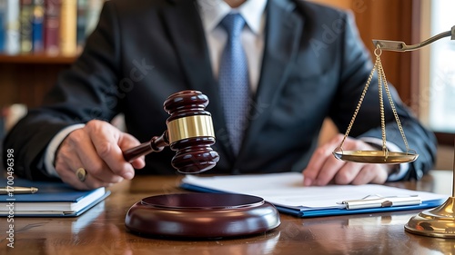 Lawyer or judge in a suit holding a gavel in a courtroom with scales of justice and legal documents on a desk