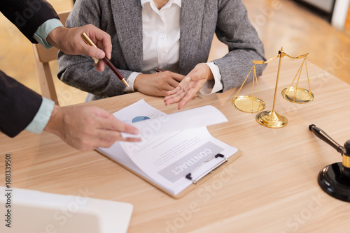 Lawyer with Document Paper and Hammer on Wood table, Judge's Gavel, Law, Justice Symbol, Agreement and Partnership Concept,