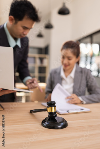 Lawyer with Document Paper and Hammer on Wood table, Judge's Gavel, Law, Justice Symbol, Agreement and Partnership Concept,