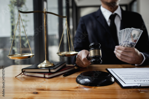 lawyer working with contract agreement at table office, lawyer holding money and justice concept, Selective focus.