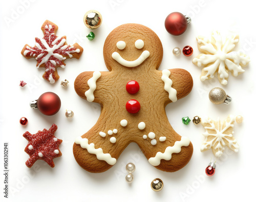 Lay flat Gingerbread man cookie isolated on white background with shadows Christmas cookies