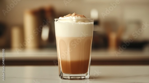 Layered coffee drink in a tall glass, topped with whipped cream and a sprinkle of spice. Rich, creamy, and inviting