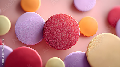Layered colorful circles artistically arranged on a soft pink backdrop, realistic, HD
