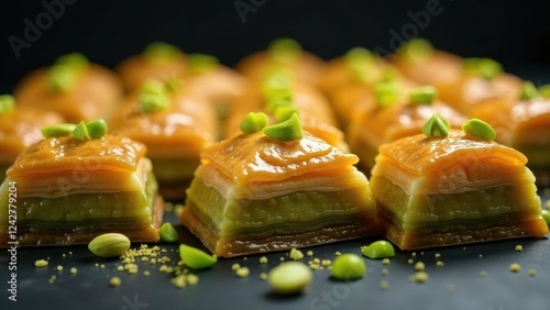 Layered Dessert Squares with Pistachio Garnish A Close-Up View of Exquisitely Crafted Sweet Treats