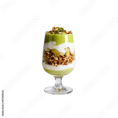 Layered Green Smoothie Parfait with Granola and Yogurt in Glass