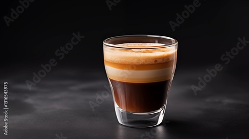 Layered Macchiato Coffee Drink in Glass on Black Background