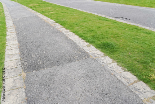 laying of sidewalks with new asphalt. Curbs enclosing the lawn, grass