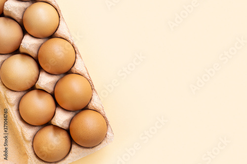 Layout or flat lay. Ecology and recycling concept. Homemade eggs in cardboard packaging in the corner on a pink background. With place for text.