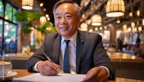 lderly man 40s 50s, wearing a suit and thinking, documents and pen in his hand, at the table in a restaurant