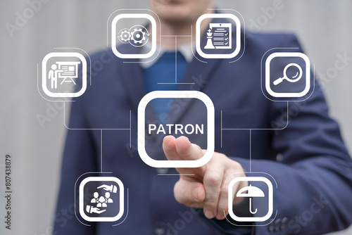 Leader working on virtual touch screen presses word: PATRON. Patron and leader concept. Patron protection, customer care, care for employees, life insurance and marketing segmentation.