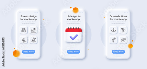 Leadership, Agent and Business targeting line icons pack. 3d phone mockups with calendar. Glass smartphone screen. Thoughts, Online auction, Court jury web icon. Vector