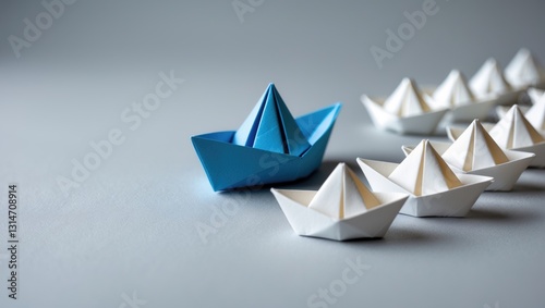Leadership concept. A blue paper boat navigating among other ships, heading towards a goal.