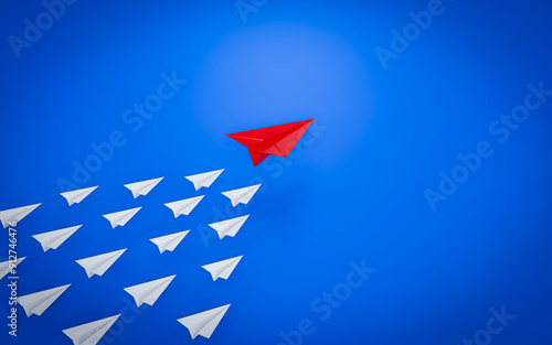 Leadership concept, red leader plane leading white plane on blue background or sky. flying paper planes for business concept. 3D Rendering