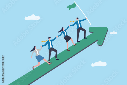 Leadership development, team success or motivation to lead team to reach goal, improvement or progress, growing together concept, businessman and woman team holding hand walk up rising growth arrow