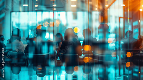 Leadership meeting and presentation with business executives discussing finance, data, and growth, with a team of business people seen through glass.