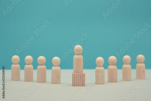 Leadership, superiority mockup. HR manager. Reach goal. Human resources, efficiency. Wooden figure on cube. Copy space