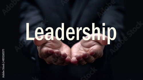 Leadership word on the hand of a businessman. Text symbol concept. Copy space.