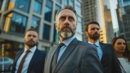 Leading with Focus: Serious Business Leader in Modern Urban Setting with Determined Team Members