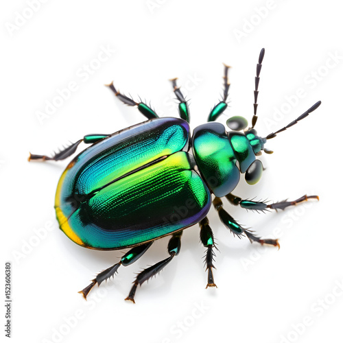 Leaf beetle Chrysolina graminis isolated on white background, dorsal view of beetle. Beautiful green insect tansy beetle.
