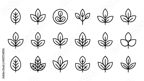 Leaf Icons: A minimalist line art illustration depicting a collection of diverse leaf designs, showcasing simplicity and elegance.