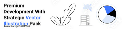 Leaf symbol, building with wind turbines, and pie chart combining nature, technology, and analytics. Ideal for sustainability, clean energy, eco-design, urban planning corporate strategy data