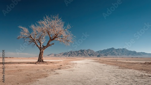 Leafless tree in arid desert landscape representing climate change, nature resilience, drought, and survival theme