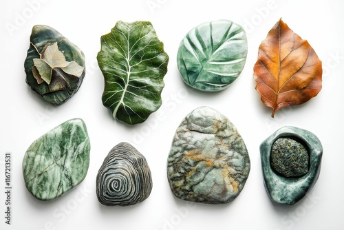 Leaf-shaped stones, natural rocks, and pressed leaves.