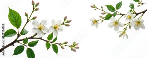 Leafy branches with delicate flowers isolated on white background, organic, still life