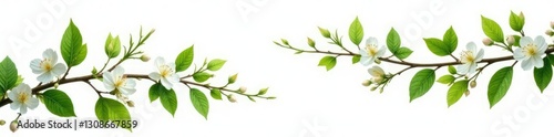 Leafy branches with delicate flowers isolated on white background, tree leaves, leafy greens, leafy greens
