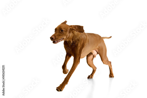 Lean athletic dog dashing forward with focused eyes and open mouth on green grass field against white studio background. Healthy purebred dog. Concept of canine strength, active domestic animals.