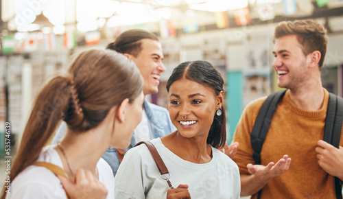 Learning, library and friends talking and bonding, having fun while meeting up for a group assignment. Diversity, education and students gathering at university to help with homework and project