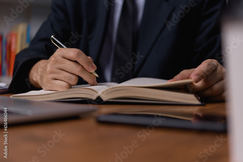 learning online class by using laptop computer and writing notebook at workplace, Education development or knowledge improvement concept.