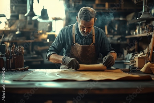 Leather Craftsman in Apron Working in Rustic Studio