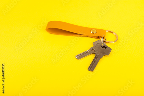 Leather keychain with a key ring on a yellow background. Concepts for real estate and moving home or renting property. Buying a property. Mock-up keychain.Copy space.