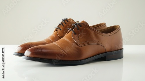 Leather shoe being polished with a cloth on a clean white surface.