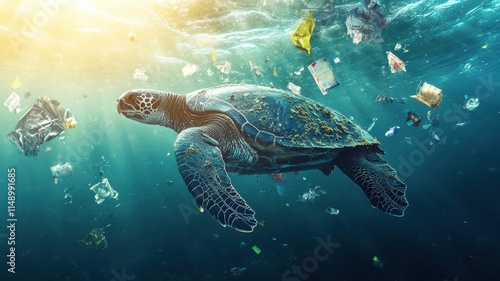 Leatherback turtle in open waters, sunlight revealing oil and microplastics