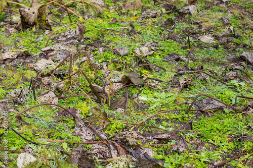 Leaves destroyed by pollution and acid rains. Background, copy space