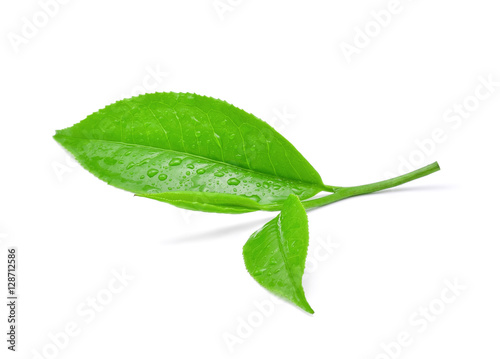 leaves Fresh green tea with drops of water isolated on white bac