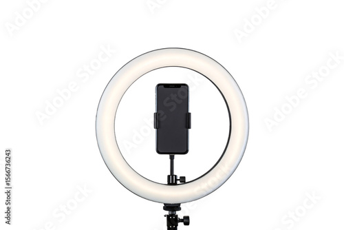 LED ring light with phone holder attachment on adjustable tripod base, isolated on a transparent background